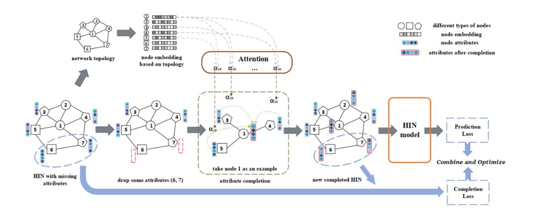 具体地,在该框架中,首先基于面向元路径的高阶拓扑信息来挖掘节点间关系,并将其作为节点之间语义关系的先验知识。接着为节点属性的补全提供了一种具有先验信息指导的、有效的注意力机制,并通过随机删除属性来实现弱监督损失的定义,从而使属性补全成为在先验知识指导下合理的可学习过程。最终在同一图神经网络框架下定义了属性补全过程和目标任务,以构建任务导向的端到端框架,实现两者的相互增强。该框架可与多数异质图神经网络模型正交,为这些模型带来稳定的性能提升。本文也希望这种新观点能够为现有的基于图神经网络的异质网络研究提供一个新的、有效的方向。