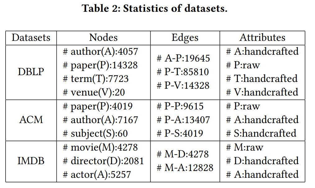 本文在三个真实的异质网络数据集上进行了实验。数据集的统计信息如下: