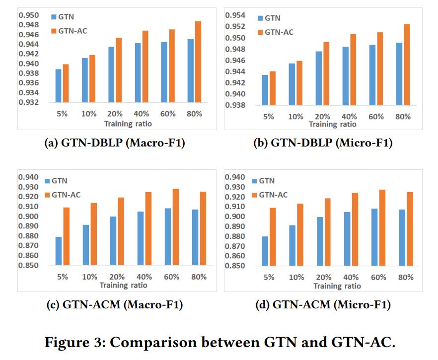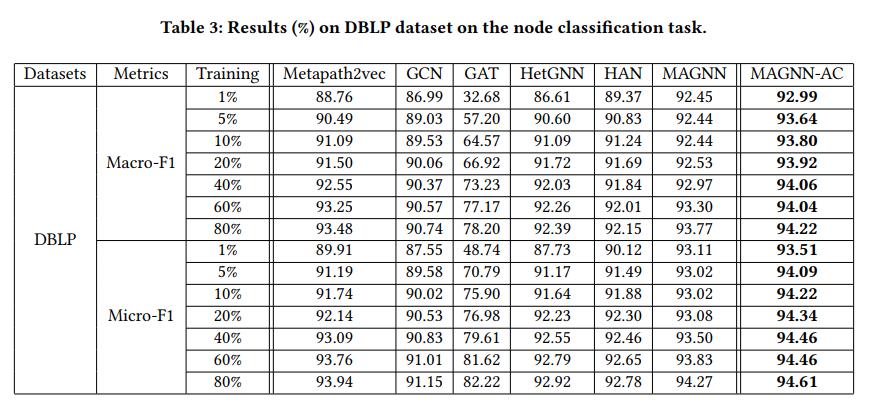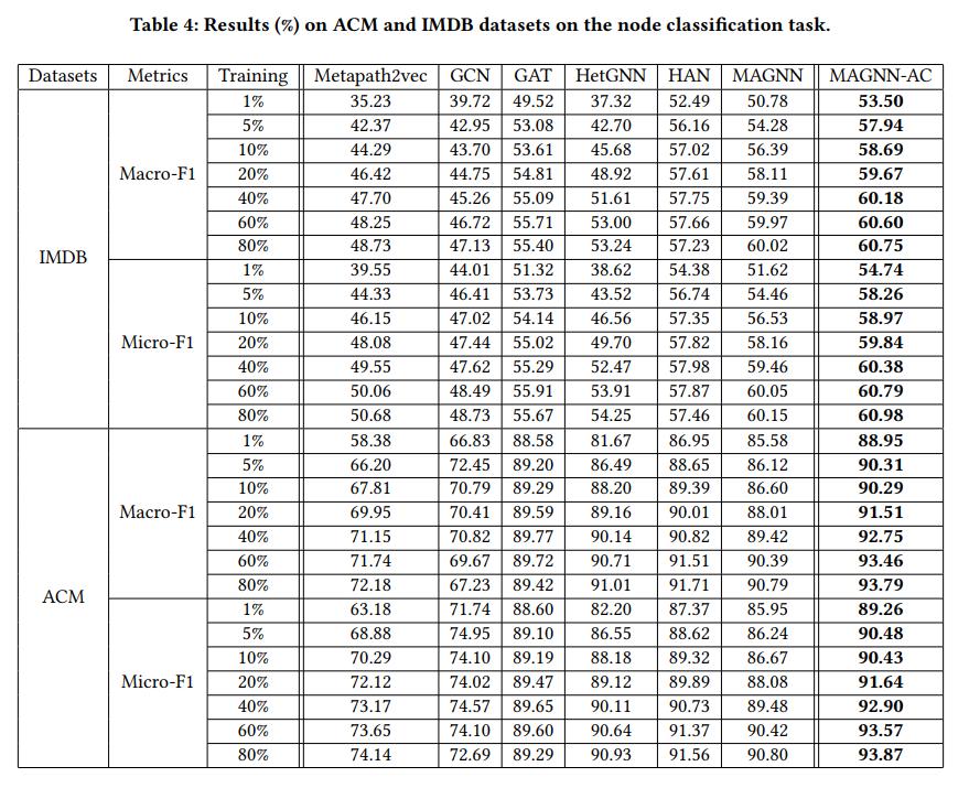 1) 节点分类结果 - 将本文提出的框架与两个异质图神经网络的 SOTA 模型(MAGNN,GTN)相结合来对 HGNN-AC 框架进行评估:
