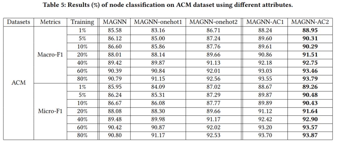 2) 案例分析 - 采用不同的属性补全方式进行实验对比,ACM 数据集中 paper 节点有属性,author 和 subject 节点没有原始属性,下表中从左到右采用的属性补全方式依次为:paper 和 subject 节点的属性向量来源于与其直接相连的 paper 节点的属性向量的平均值;author 节点的属性向量为 one-hot 向量,subject 节点的属性向量为与其直接相连的 paper 节点的属性向量的平均值;author 和 subject 节点的属性均为 one-hot 向量;author 节点的属性通过本文提出的方法进行补全,subject 节点的属性为 one-hot 向量;author 和 subject 节点的属性均通过本文提出的方法进行补全。