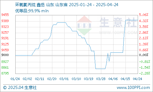 本周环氧氯丙烷市场高位坚挺运行。临近五一假期,市场现货库存供应紧张,节前补货资源偏紧,厂家挺价心态积极。据生意社监测分析系统显示,截止4月24日,生意社环氧氯丙烷基准价为9400元/吨,与4月初相比,上涨了5.62%。