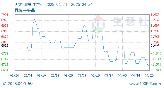 原料端:原料丙烯市场价格小幅下滑。据生意社行情分析系统显示,截止到4月24日,生意社丙烯基准价为6710.75元/吨,与本月初(6745.75元/吨)相比,下降了-0.52%。