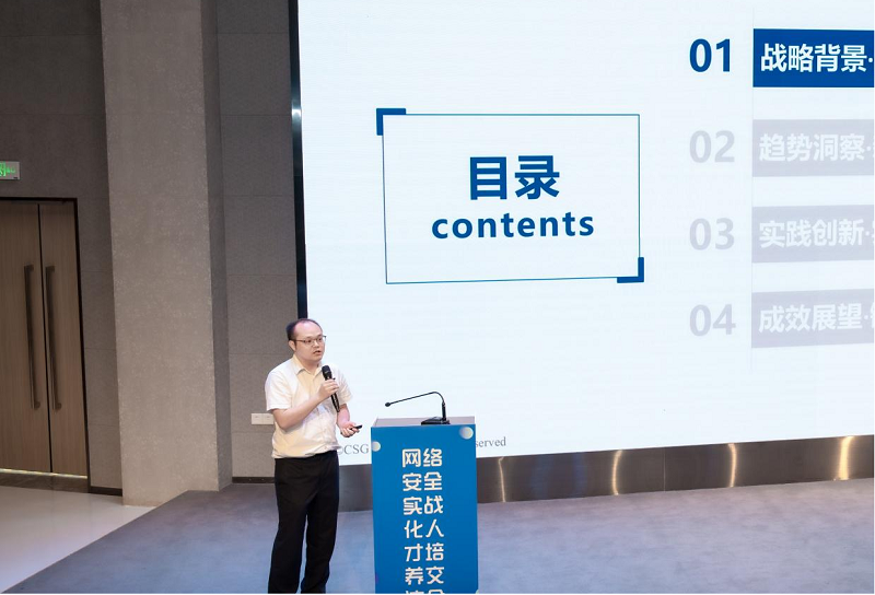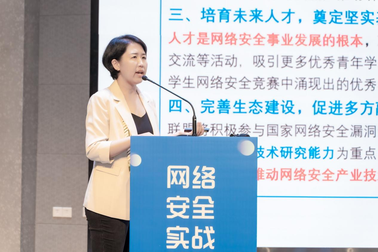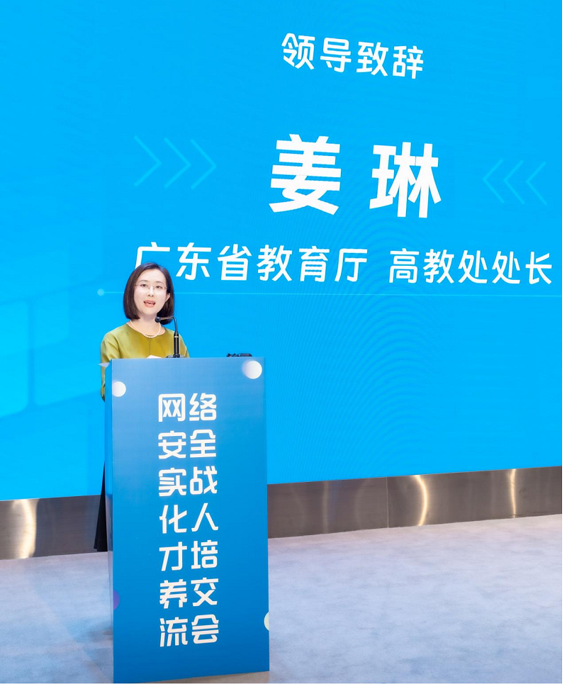 图:广东省教育厅高教处处长姜琳广东省教育厅高教处处长姜琳指出,本次交流会吸引省内31所高校参与,凸显网络安全实战人才培养是事关国家发展大局的重要事项,是高校学科建设的重点领域。省教育厅将持续联合高校、企业推进联合育人实战强化行动,实施“实战化人才培养数字赋能行动,通过构建“战、训、产、教”一体化体系,多维发力培养实战型人才,同步推动学科建设与实训基地建设。