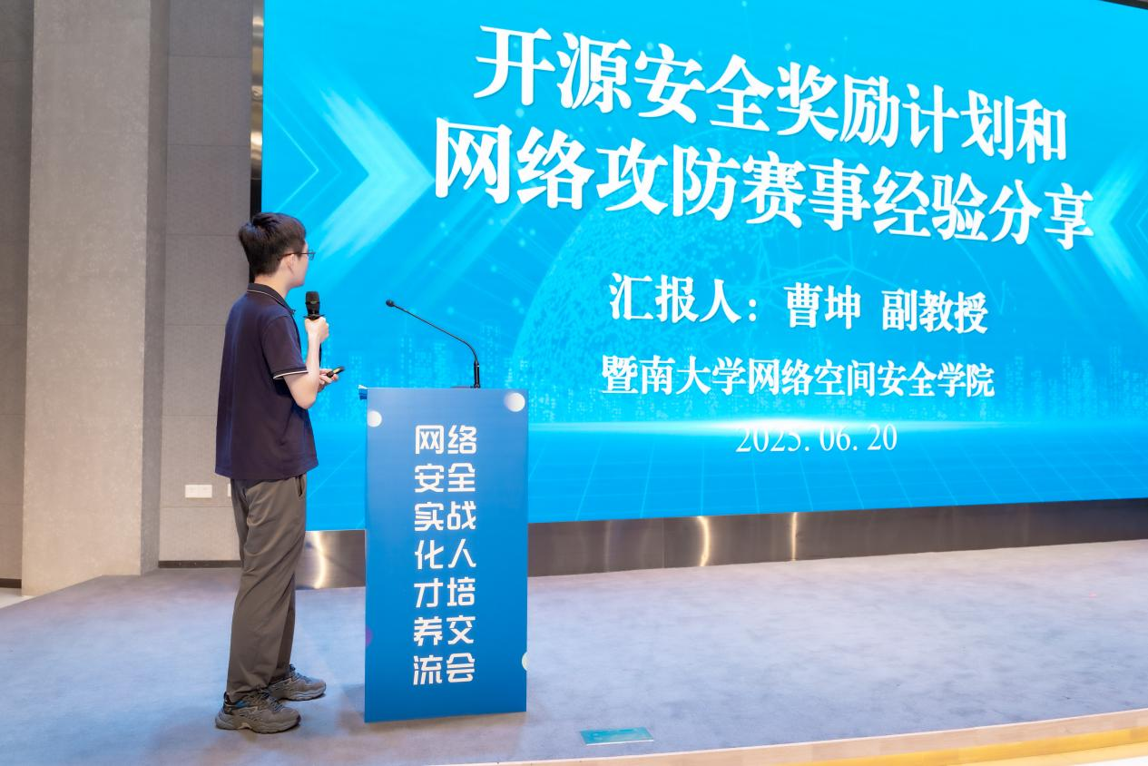 广州大学网络空间安全学院副院长王乐暨南大学网络空间安全学院副教授曹坤分享了通过“开源安全奖励计划”和“攻防赛事”经验,以赛促学、以赛促练,加速学生从理论知识到实战应用的转化,实现“学以致用”的宝贵经验。