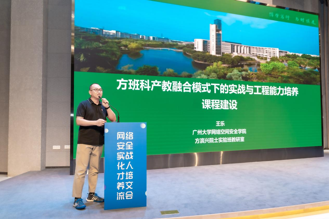 图:中山大学网络空间安全学院副院长黄方军广州大学网络空间安全学院副院长王乐介绍了独具特色的“方班科产教融合模式”,通过假期营、演武堂等创新形式,构建了突出实战与工程能力培养的课程体系,提供了应用型人才培养的成功范例。