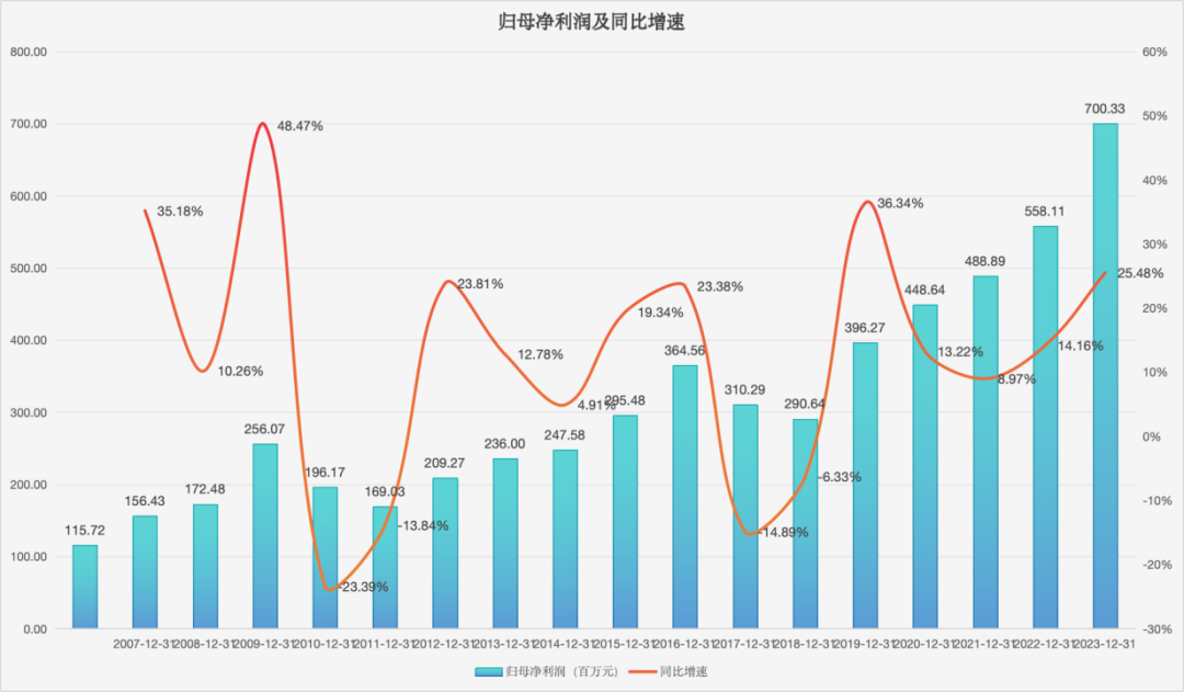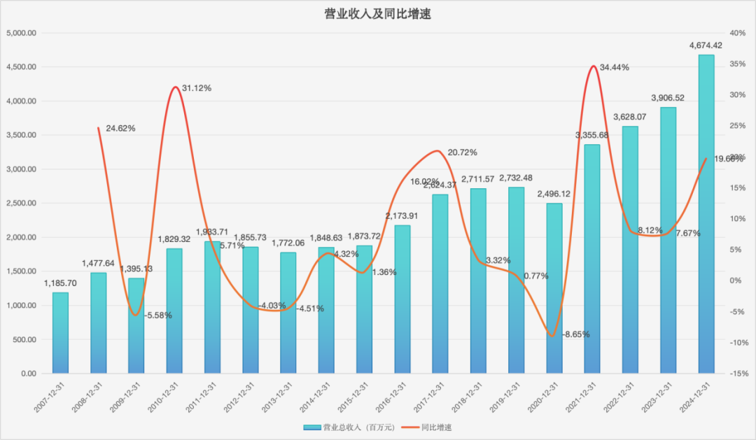 从伟星股份的历史业绩来看,公司收入和归母净利润都是波动上涨,当然,可以看出一定的周期性,隔个5-8年会走一个轮回,增速从低谷到高峰,然后再落为低谷。2024年收入为46.74亿,是2014年的2.5倍,也是2007年的4倍;2024年归母净利润为7亿,是2014年的2.8倍,2007年的6倍。