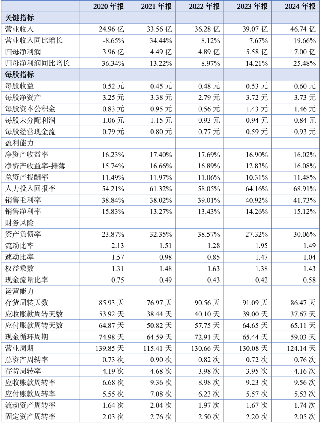 公司2024年收入为46.74亿元,同比增长19.66%;归母净利润为7亿,同比增长25.48%;整体毛利率为41.73%,净利率为15.12%,净资产收益率为16.02%。2025年一季度营业收入为9.79亿,同比增长22.32%,净利润为1亿,同比增长28.76%。