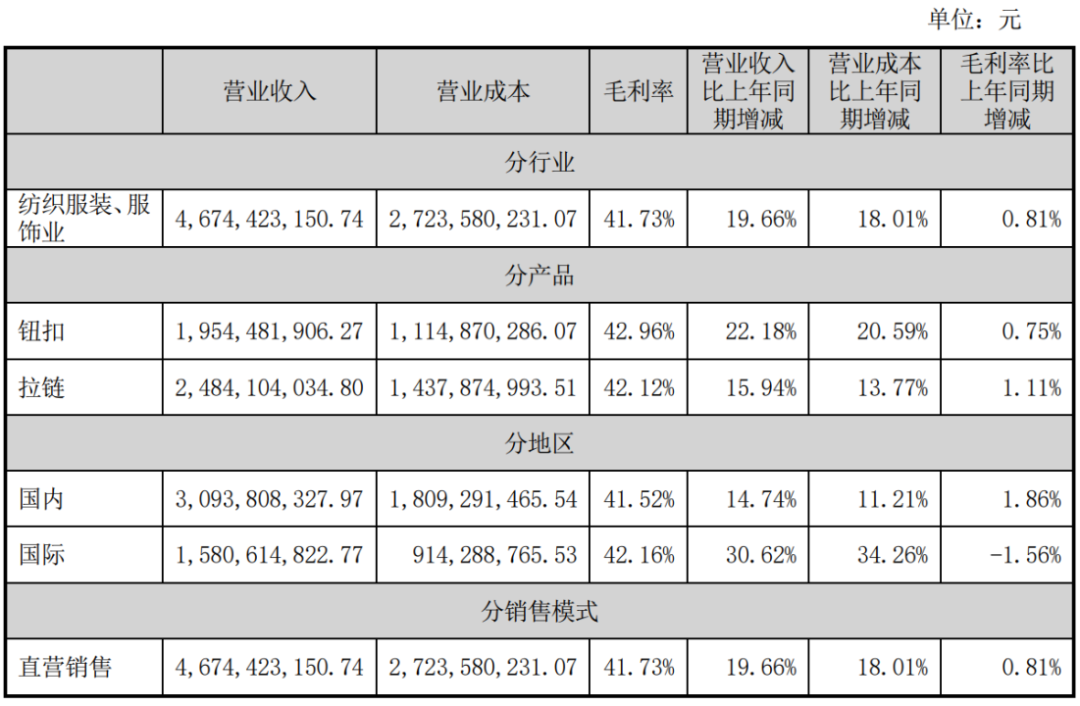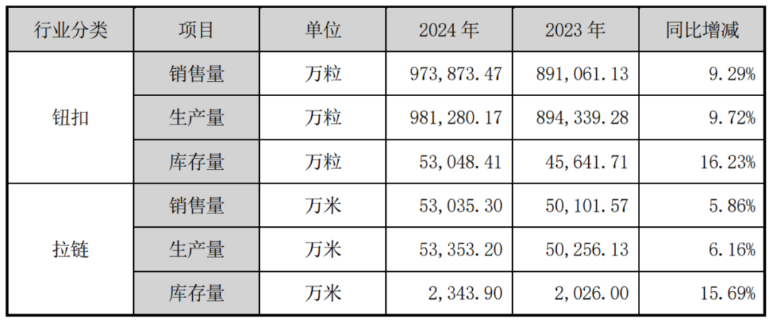 公司在国内外建有九大工业园区(包括临海、潍坊、孟加拉、深圳、越南、东莞等地),现已形成年产纽扣120亿粒、拉链9.10亿米的生产能力,2024年产能利用率分别为82%、58%。公司的纽扣和拉链的毛利率都在40%以上,属于简单也赚钱的生意,对应着“穿”和“用”的需求,是一项基本的物质需求,而扣子、拉链则是各种衣物、箱包等的一种重要配件,这些配件的单位价值量不高,比如纽扣,公司2024年卖了98亿颗,收入为19亿,每颗价格不到2毛钱。