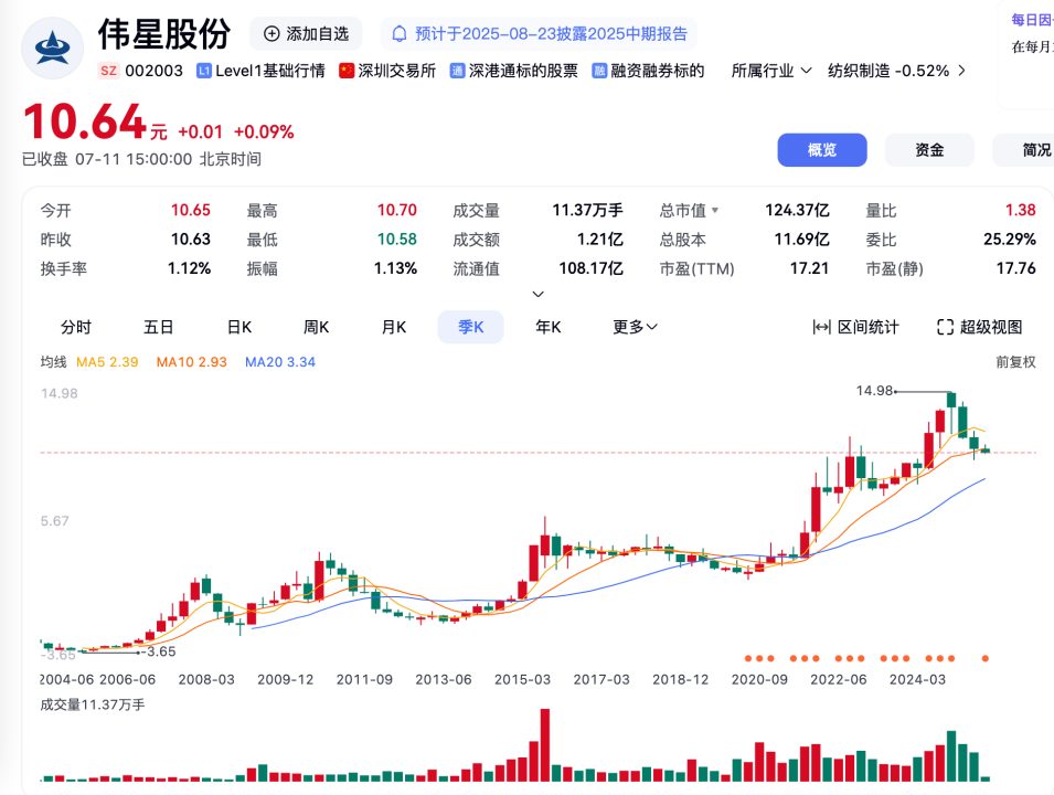 伟星股份成立于1988年,主要从事钮扣、拉链、金属制品、塑胶制品、织带、绳带和标牌等服饰及箱包辅料产品,2004年6月25日在深交所上市。公司总部位于浙江省临海市,控股股东为伟星集团有限公司,截至2025年3月底,持有25.87%的股份,公司实际控制人是章卡鹏、张三云,两人为一致行动人,分别持有伟星集团15.97%、10.88%的股份,同时直接持有公司5.67%、3.76%的股份。