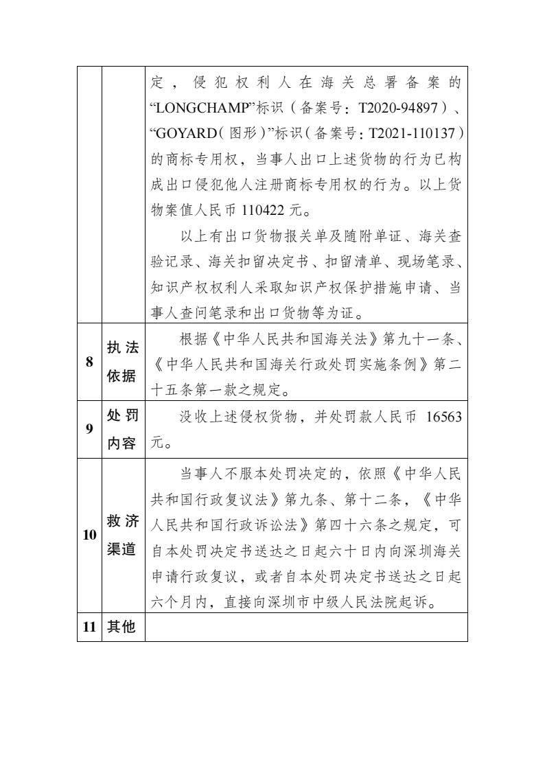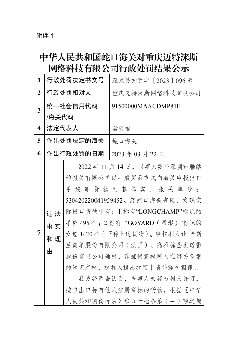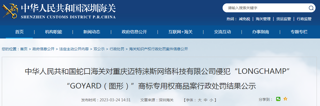中国质量新闻网讯 近日,蛇口海关发布对重庆迈特涞斯网络科技有限公司侵犯“LONGCHAMP”“GOYARD(图形)”商标专用权商品案行政处罚结果公示。